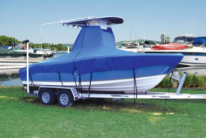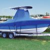 Bow and stern sections zip together for single-person installation. “Console tube” secures up underneath the T-Top. Protects the center console and will accommodate most sizes and positions of tops and consoles on boats up to 25’4″. Tie-Downs System included – system relieves stress on the zippered ends during over-the-road trailering. No cut out patterns for boats with sea mount style engine bracket – no cut out in stern section. Now available for boats without bow rails.